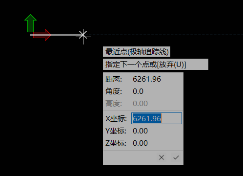 软件界面的下部区域为捕捉工具,如图 1.3-3所示,从左到右的捕捉工具依次为:对象捕捉、对象捕捉追踪、极轴追踪、正交模式、格栅捕捉、锁定平面和捕捉设置,点击各类设置按钮可以弹出设置对话框。在光标右下侧为追踪面板,可以设置距离、角度、X坐标、Y坐标和Z坐标参数,基于预设追踪规则,可以预显追踪线,如图 1.3-4所示,二者均为精确定位与精确建模而设计。