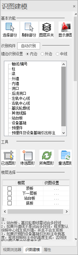 【识别构件】:可识别的构件类型包括轴线/轴号、柱、梁、外墙、内墙、洞口、后浇洞口、左轨中心线、右轨中心线、基坑轮廓线、其他线路、站台板、设备基础、预埋件、预埋件及设备基础引出标注、预埋件定位标注。识别构件要在【待选图形】状态下进行。