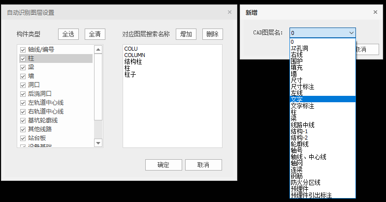 【自动识别】:点击【自动识别】图标,弹出如图 2.3-5所示的对话框。左侧对话框中的内容为被识别的构件类型,支持全选/全清。右侧对话框中则显示程序默认的某构件类型在图纸中对应的图层搜索名称。