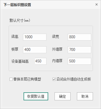 点击每一楼层右侧的【识图设置】按钮,还可以对每一楼层需要生成的构件进行参数设置,其中包括梁高、梁宽、板厚、内外墙厚、设备基础高等参数。同时还可以对替换本层已有模型和沿闭合墙自动生成板等选项进行勾选。