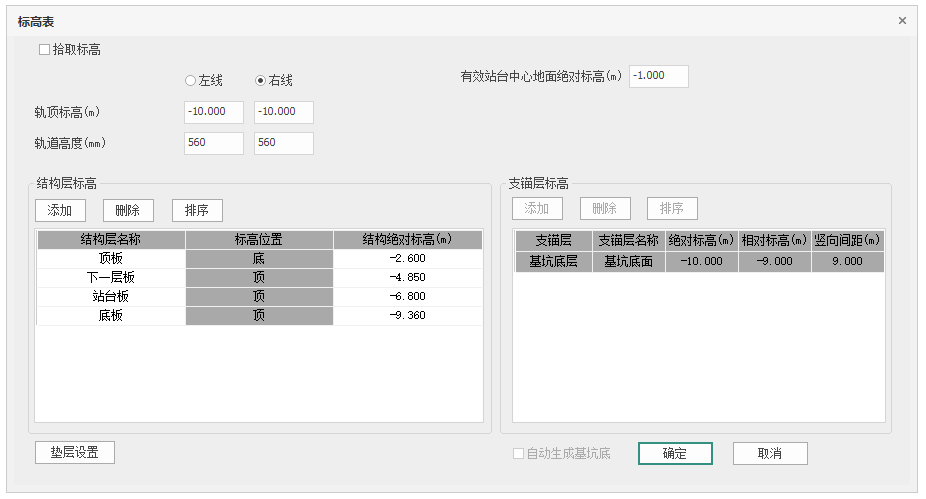 标高表功能可定义有效站台中心地面绝对标高、结构层标高和轨道中心线绝对标高,支锚层标高在【主体结构】模块中无法生成,需切换到【围护结构】模块中进行生成编辑。