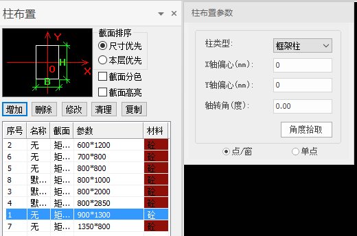 布置参数对话框中包括柱类型、X轴偏心、Y轴偏心、轴转角等布置参数等。