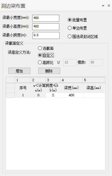 洞边梁截面尺寸支持选截面、自定义和根据洞边梁高跨比自动计算方法定义。