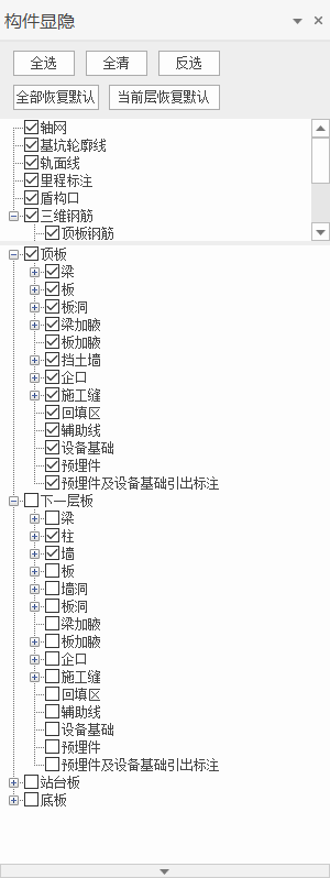 该功能在分层和整体模型下能够提供各类构件显隐以及选择的功能,可以快速显示、隐藏或选择、删除某些构件,方便进行建模或模型修改。同时支持全选、全清、反选、全部恢复默认、当前层恢复默认等功能。