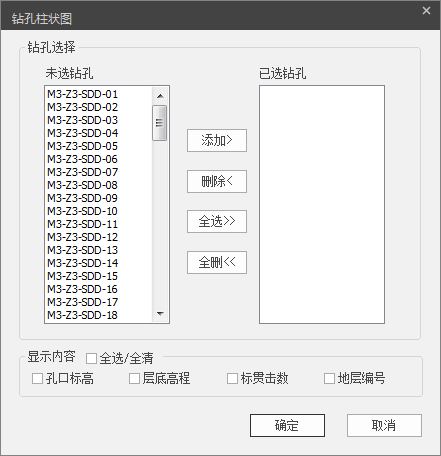 【显示内容】:用户可以选择钻孔柱状图上表达的内容。程序支持全选和全清功能。