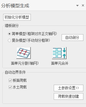 模型支持自动完成总参定义的面荷载与顶底板水土荷载自动布置到板元。用户应该注意先完成面单元的剖分,确保板块划分至导荷状态。