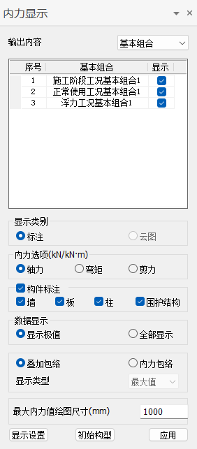【输出内容】下拉菜单中可选择需要进行显示的荷载组合。对应荷载组合下,可复选荷载组合下各工况,被勾选的工况内力计算结果会参与内力显示。