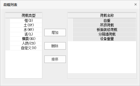 荷载名称:为同一荷载类型下,具体的单荷载工况,其中预定义荷载名称不可删除,但用户可进行自定义,并可删除自定义的荷载名称。