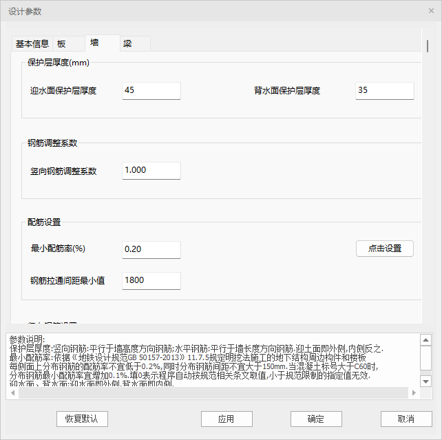 墙/板:设置结构保护层厚度;设置配筋调整系数;设置最小配筋率;设置受力钢筋配筋设计形式倾向;设置分布钢筋及拉筋构造配筋形式;