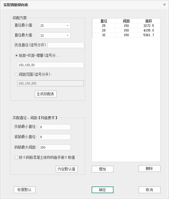 【生成级配表】按照用户设置的受力钢筋级配方案,生成所有可能的钢筋直径-间距组合,并显示于对话框右侧列表中。列表中的配筋组合将用于程序初始化配筋方案的确定。实配钢筋构造要求设置,会自动过滤不满足构造的级配方案。