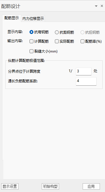 【显示内容】单选项,可选择抗弯钢筋、抗剪钢筋,控制配筋设计界面显示的配筋设计内容;