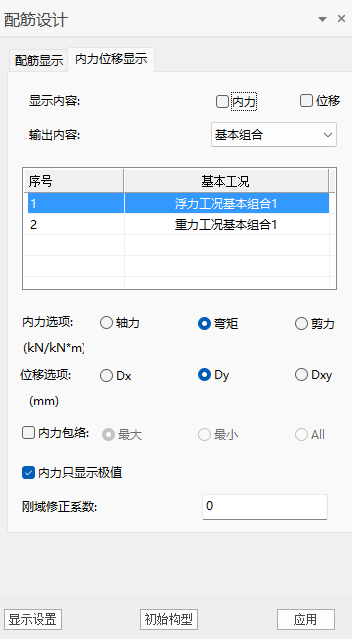 内力位移显示选项卡主要控制叠加显示的内力图/位移数值,用于辅助查询杆件分析结果。