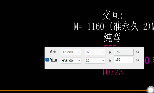双击配筋对话框后,对杆件跨中可修改通长钢筋配置,对杆件端部可修改支座附加钢筋配置,修改后即时生效。