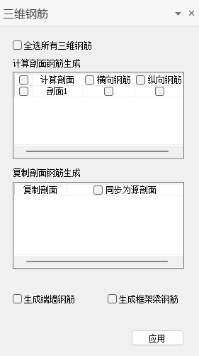 用户可通过勾选需要生成的三维钢筋类型,其中标题栏复选项可用于快速勾选/取消。完成勾选后,单击【应用】按钮,程序将自动读取计算结果,并在对应计算剖面位置生成三维钢筋。
