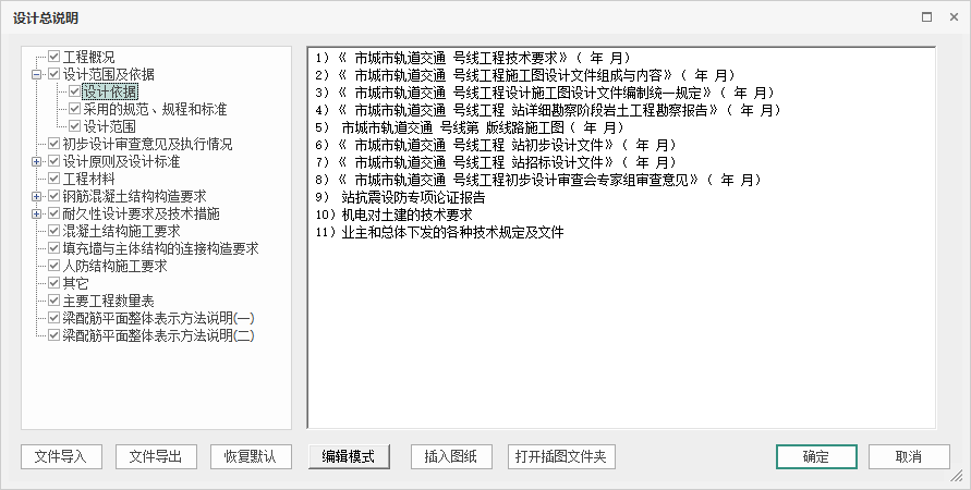 单击【设计总说明】按钮,弹出如图 7.2-1所示的对话框。对话框左侧为文本目录,右侧为当前目录对应的文本。右键目录标题,支持插入子项、上方插入项、下方插入项、重命名、删除操作。