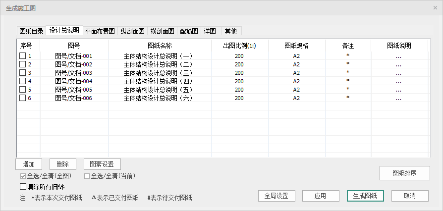 对话框最上方为分页签,每一个页签代表一类图纸,包括图纸目录、设计总说明、平面布置图、纵剖面图、横剖面图、配筋图、详图、其他等类别。