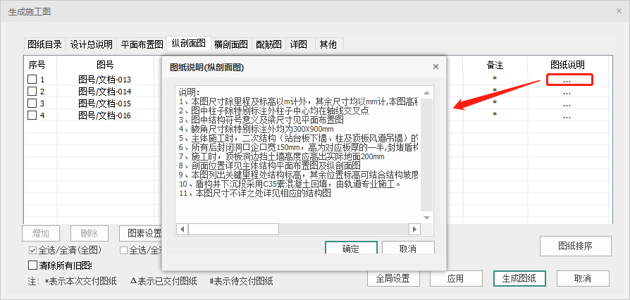 每一个页签下包含的内容为序号、图号、图纸名称、出图比例、图纸规格、备注、图纸说明。程序会根据相关的出图设置和图纸张数对图号进行自动排序;图纸名称、出图比例、图纸规格和备注均可交互修改;点击图纸说明中的“…”符号,会弹出如图 7.2-5所示的图纸说明对话框,用户可交互相关内容。在设计总说明和其他页签下,还可以增加和删除图纸张数(只有自定义增加的图纸可以被删除),在生成施工图时,程序会对新增的图纸自动排号并生成相应的图框。