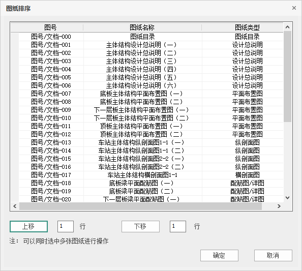 【图纸排序】:点击图纸排序,弹出如图 7.2-6所示的对话框,在这里可以对默认的图纸排序进行调整。支持同时选中多张图纸进行上移和下移操作。
