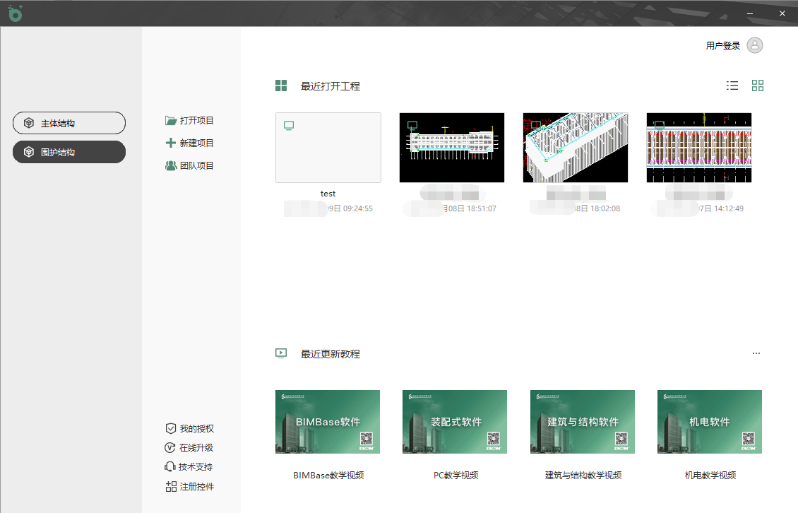 程序启动界面如图 1.2-1所示,用户将启动环境选为【围护结构】,并可根据需要,点击【打开项目】或【新建项目】开始设计操作,程序保存文件格式为.P3D: