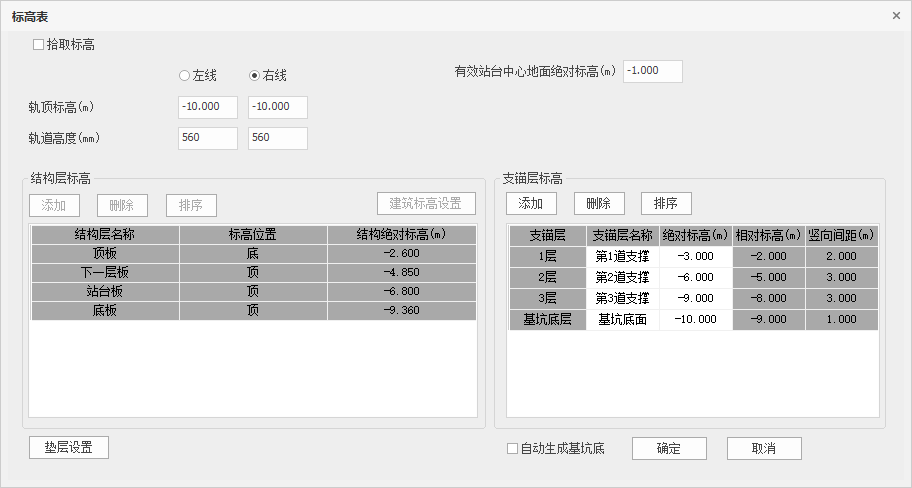 标高表功能可定义有效站台中心地面绝对标高、支锚层标高和轨道中心线绝对标高(结构层标高在围护结构模块中只做展示,并不能修改)。