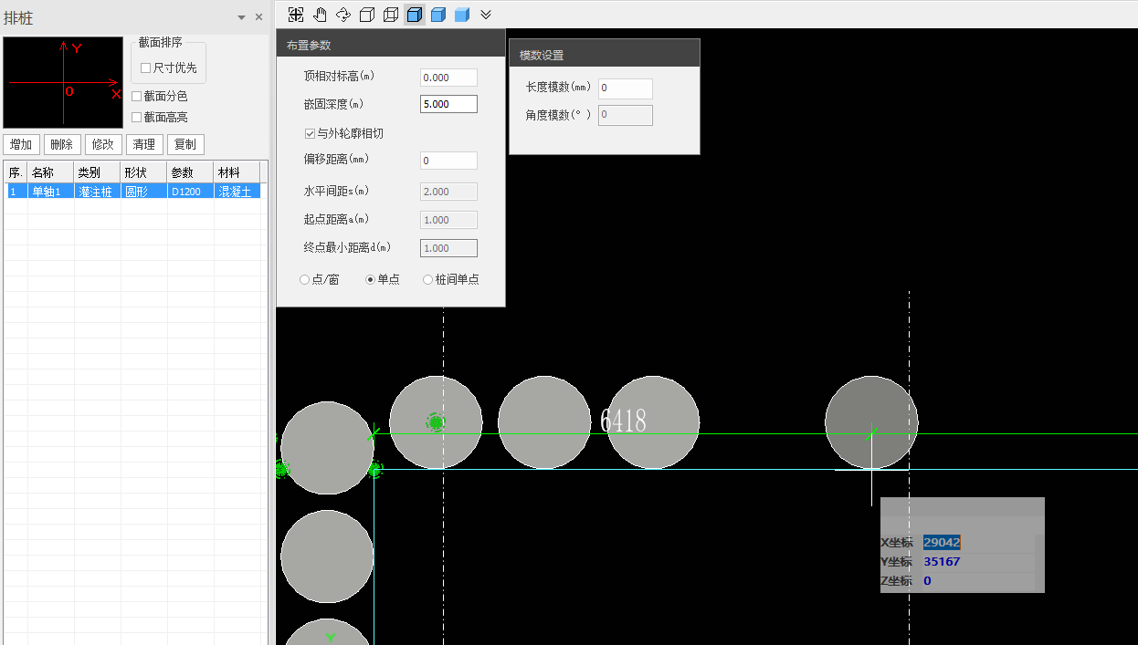 用鼠标在截面定义列表中点取一种桩类型后,移动鼠标到平面上需要的位置,选择多桩或单桩方式完成排桩布置。如果存在偏移距离,相对标高、嵌固深度、桩间距等差别,可同时在布置参数框中填写相应的参数值。