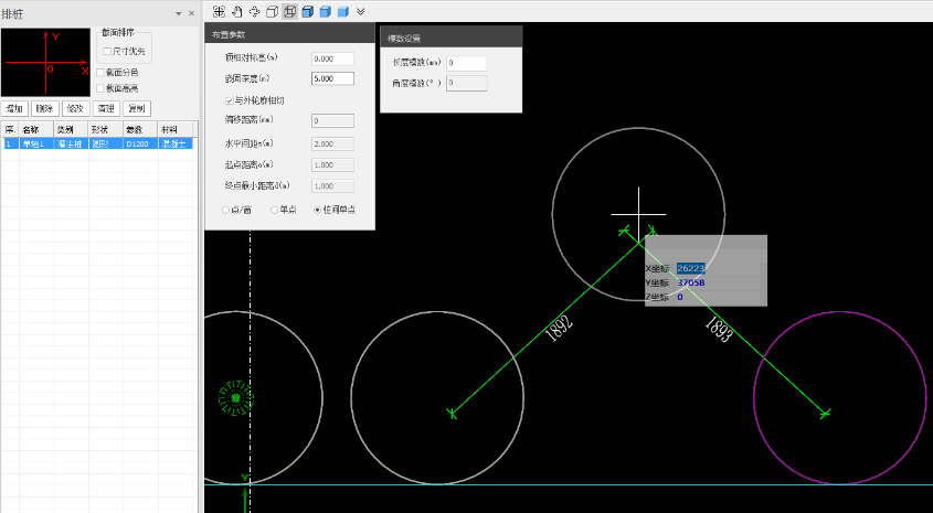 单击【排桩】按钮后在屏幕左侧弹出排桩对话框,同时弹出布置参数框,如图 2.8-2所示:
