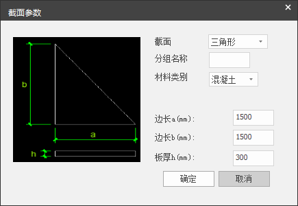 单击【增加】按钮,弹出【截面参数】对话框,用户可对板撑截面类型(三角形如图 2.8-27、三角形+H型钢组合如图 2.8-28)、分组名称、材料类别(混凝土、钢)、以及截面尺寸进行定义。完成后单击【确定】按钮,板撑参数自动添加到截面列表中;点击【取消】,退出本次交互。