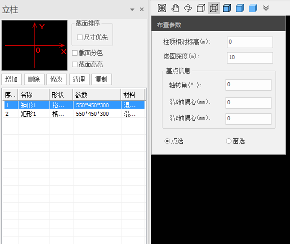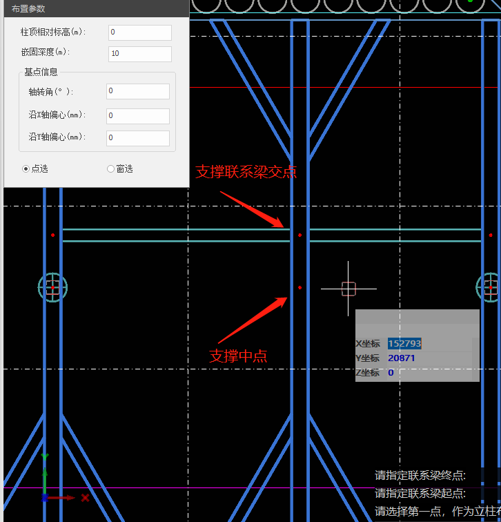 立柱的布置参数有4个:柱顶相对标高、嵌固深度、基点信息和布置方式。