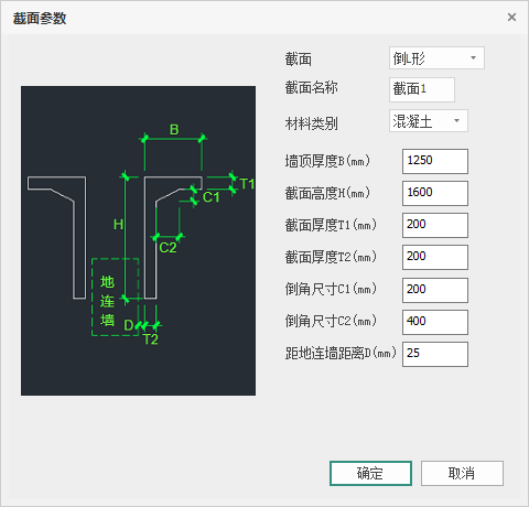 点击【增加】按钮,弹出如图 2.8-51所示的导墙截面参数定义对话框。用户可以对挡墙的截面形式(倒L形、C形)、截面名称、材料类别、几何参数进行设置。完成后点击【确定】,自定义的挡墙被添加到挡墙列表中,点击【取消】,退出本次编辑。
