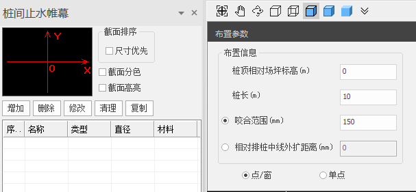 桩间止水帷幕可选【点/窗】、【单点】两种布置方式。