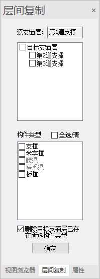 【删除目标支锚层已存在所选构件类型】:勾选时,先删除目标支锚层对应已选构件,再复制源支锚层构件;取消勾选时,目标支锚层对应已选构件不删除,复制源支锚层构件,层间复制后可出现构件覆盖、重叠现象。