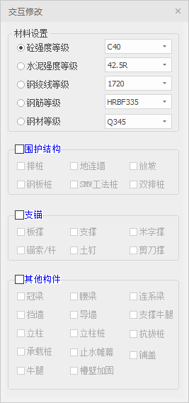 【交互修改】目前支持修改围护结构、支锚、其他构件的混凝土强度等级、水泥强度等级、钢绞线等级、钢筋等级和钢材等级。注意,如果构件定义中指定了材料是混凝土,则无法指定此构件的钢号,反之亦然。对于型钢混凝土构件,二者都可指定。模型中存在的构件类型可以在交互修改中勾选修改,不存在的构件类型为灰显不可修改。