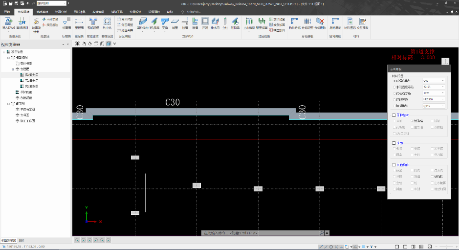 另外,当在“交互修改”对话框的构件类型列表中选择了一类构件时,模型上将标出所有该类构件的材料强度,效果如下图 2.12-3: