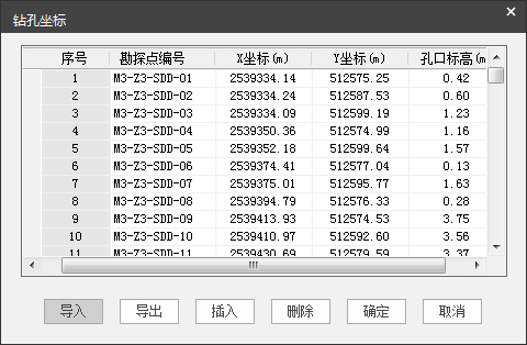点击菜单栏中的【钻孔坐标】图标,弹出如图 3.3-1钻孔坐标对话框所示的对话框。表中包括勘探点标号、X坐标、Y坐标、孔口标高等数据。