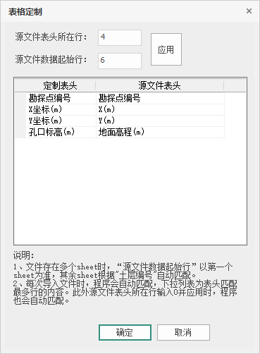 用户可以修改源文件表头所在行和数据起始行。修改并点击应用后,程序会把源文件中选定的表头所在行的每一列名称录入到【源文件表头】下的每一个下拉菜单中,并重新进行自动匹配,如匹配不成功,显示”未匹配”,并红色高亮显示,用户可自行手动选择匹配,如图 3.2-3所示。在匹配完成后点击确定,对话框关闭,数据导入;点击取消,数据不录入,对话框关闭。