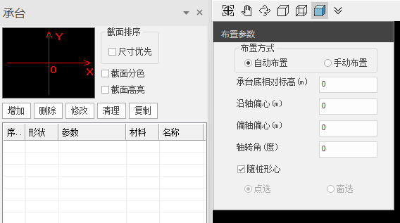 布置参数包括相对标高(相对基坑底面高度)、沿轴偏心、偏轴偏心、轴转角。【随桩形心】默认勾选,勾选时,承台形心自动和桩心保持一致,转角、偏心等均保持一致。