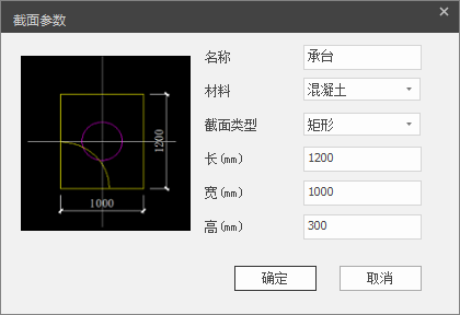 点击【增加】弹出承台截面参数对话框,如图 3.4-6,对承台名称、材料、截面类型、长、宽、高进行设置。完成后单击【确定】按钮,参数自动添加到《承台》对话框列表中;点击【取消】,退出本次交互。