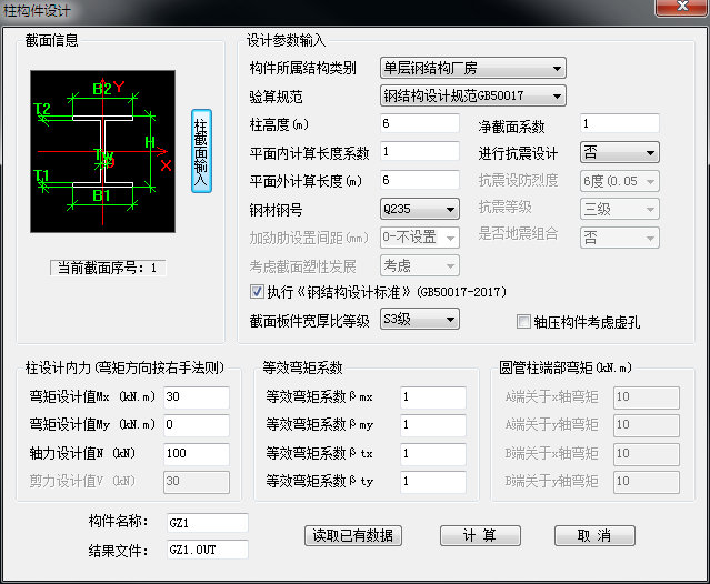单击【钢立柱验算】图标,程序进入钢立柱验算界面,如图 4.2-14所示。输入相关计算参数后,点击计算可以生成相应的计算书,如图 4.2-15所示。