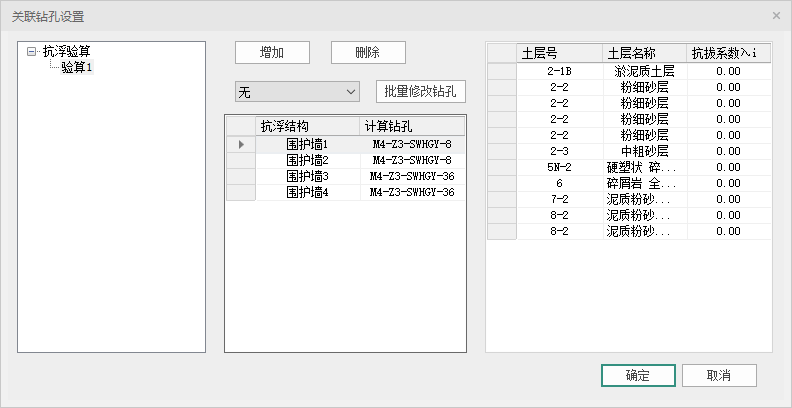 【区域选择】完成后,点击【钻孔设置】,弹出对话框,然后选择验算项,点击【增加】按钮,选择要参与抗浮的围护构件和抗拔桩,如图 4.3-6所示,选好并右键确定后,再在对话框里选择围护构件和抗拔桩对应的计算钻孔,点击【确定】,完成钻孔设置。程序支持钻孔的批量修改。