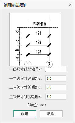 【轴网标注】:用来设置施工图中轴网的尺寸标注与结构边线之间的间距,如图 5.1-3所示。
