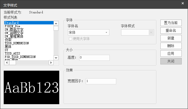 点击【基本参数】-【文字设置】弹出如图 5.1-4对话框,该对话框中用户可以对图纸中的各类文字进行大小和样式设置,文字大小为输入项,数值为按出图比例1:1填写,单位mm,文字样式为下拉选项,具体样式可以点击【文字样式】按钮进行设置,包括字体大小、字体样式和宽度因子等内容,如图 5.1-5所示。