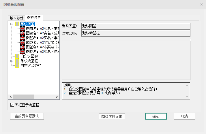 点击【图签设置】弹出如图 5.1-8对话框,程序中预存多项系统图签和会签栏供选择,如果想要导入自定义图签或会签栏,可以右键单击【自定义图签】或【自定义会签栏】选择导入。