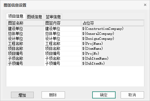 点击【图签信息设置】弹出如图 5.1-9所示的对话框,用户可以在此设置图签内容以及查找相应内容对应的占位符。