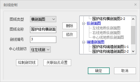 剖线参数设置:左侧部分为剖切参数设置,包括【图纸类型】(横剖面图、纵剖面图、端墙地质剖面图、多段线纵剖图、自定义剖面图)、【图纸名称】、【剖线编号】、【中心线剖切】(往左线剖视、往右线剖视、无)、【关联钻孔设置】。