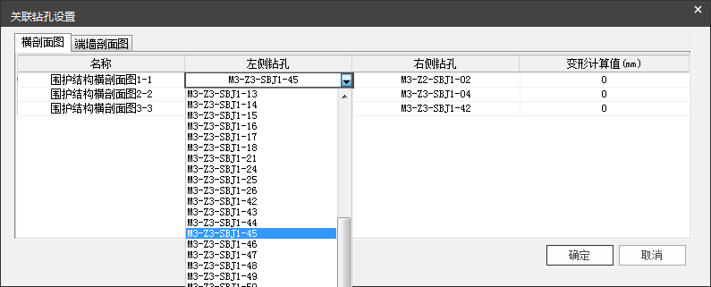 点击【关联钻孔设置】,弹出如图 5.2-3所示的对话框,用户可以选择某剖面图关联的钻孔,并在生成剖面图时在两侧生成钻孔柱状图;也可以交互该剖面对应的变形计算值。