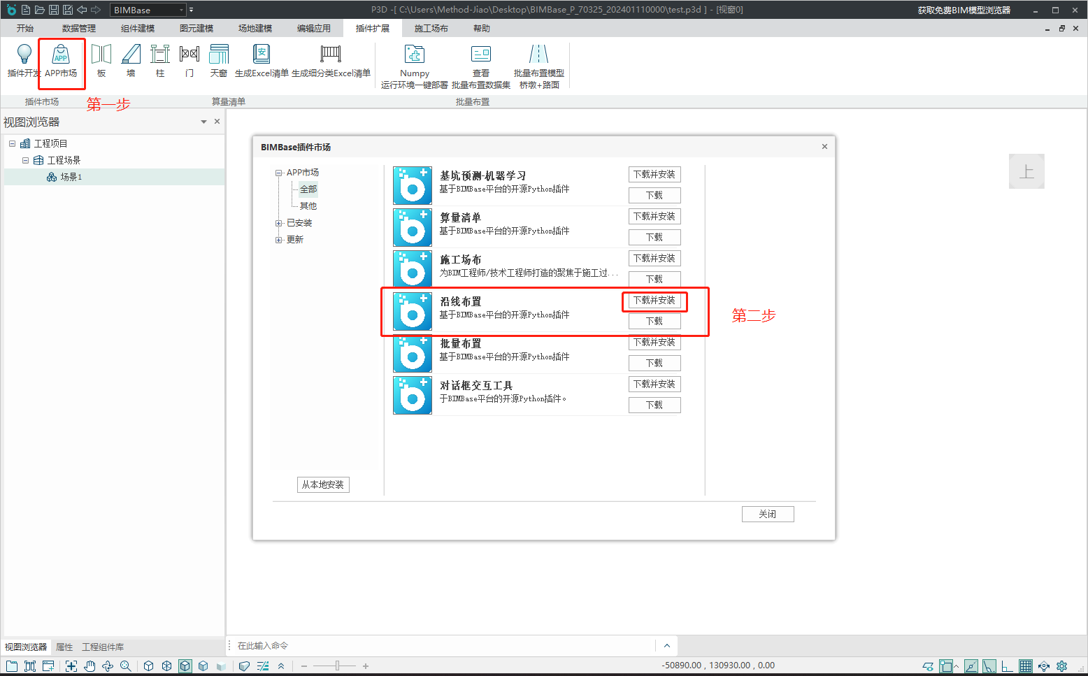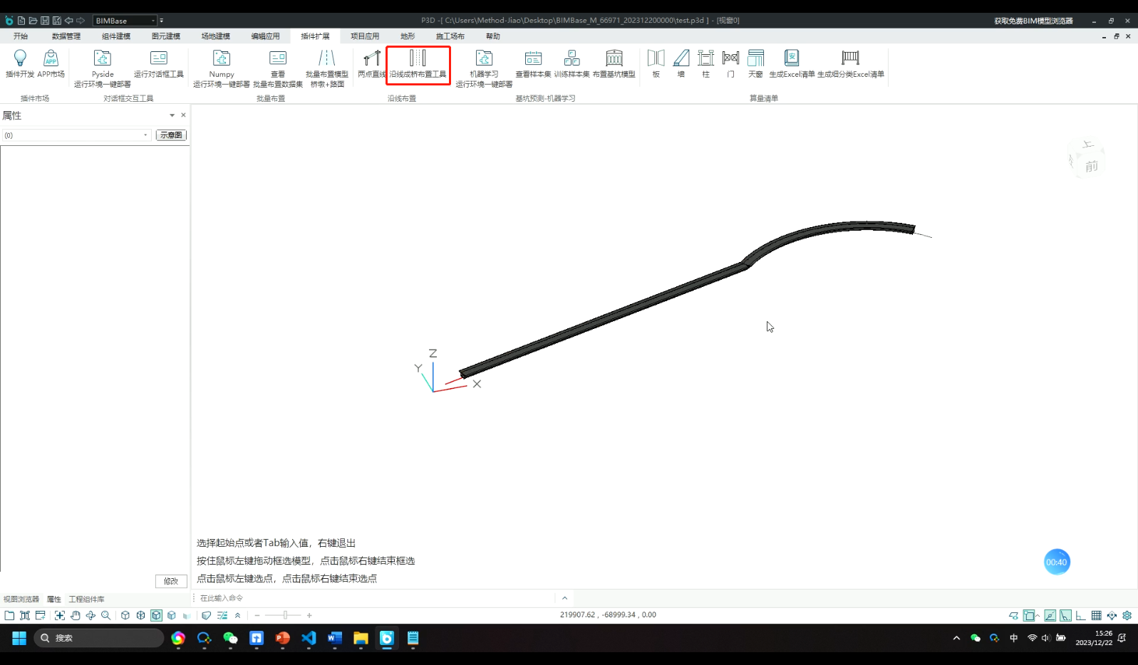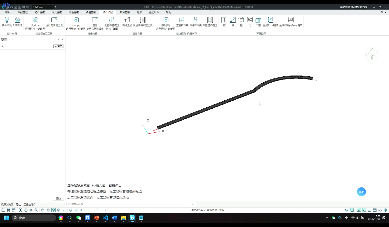 目录 搜索 展开 一.插件开发入门1 环境配置与基础开发1.1 软件安装与VSCode环境配置1.2 软件界面介绍与基础概念2 Python插件开发2.1 Python插件开发标准工作流2.2 实战Python组件库插件开发2.3 实战Python插件开发2.4 插件的打包发布流程3 核心pyp3d库介绍3.1 第一个Python模型3.2 构件库社区4 Python第三方库使用指南4.1 本地环境安装第三方库4.2 使用bat-pip方式安装4.3 Ribbon菜单配置bat5 实际案例5.1 机器学习-基坑预测5.2 露营场布6 常见问题与注意事项6.1 常见终端报错6.2 布置成功后看不见模型6.3 关于布尔后变多面体(精度下降)的解决方法二.Python建模接口文档1 主要函数1.1 圆弧线:Arc1.2 立方体:Cube1.3 缩放函数:Scale1.4 线:Line1.5 截面 Section1.6 扫掠体 Sweep1.7 放样体 Loft1.8 球 Sphere1.9 圆柱体 Cone1.10 四棱台 Box1.11 圆角管 FilletPipe2 旋转、平移、镜像2.1 旋转 rotate2.2 平移 translate2.3 镜像 mirror2.4 就近原则3 线性排布 Linspace4 布尔与组合5 文字6 贴图7 进阶内容7.1 旋转布置/两点布置7.2 如何实现属性表下拉选项7.3 进阶函数8 生成BFA文件三.Python插件接口文档1 基础接口1.1 选择工具1.2 几何实体1.3 属性获取1.4 属性操作2 进阶接口2.1 制作动画2.2 制作对话框2.3 调用BIMBase命令2.4 对话框demo四.BIMBase插件案例说明书BIMBase插件-3D打印BIMBase插件-算量清单BIMBase插件-基坑预测-机器学习BIMBase插件-沿线布置BIMBase插件-对话框交互工具BIMBase插件-批量布置 暂无相关搜索结果! BIMBase插件-沿线布置 BIMBase插件-沿线布置插件简介基于BIMBase建模软件的开源Python插件,案例内展示实现了具有视图交互能力的沿线布置功能,欢迎零基础的用户探索实现自己的机器学习探索功能。案例内包含完整的使用教程与代码注释,对于零基础开发人员也有非常友好的体验。 插件运行效果 插件安装运行步骤 三步走沿线布置-插件下载 1.下载安装 2.点击运行划线工具 绘制线路 3.框选线路,右键确认。点选起点,右键确认。点选终点,右键确认 提交评论