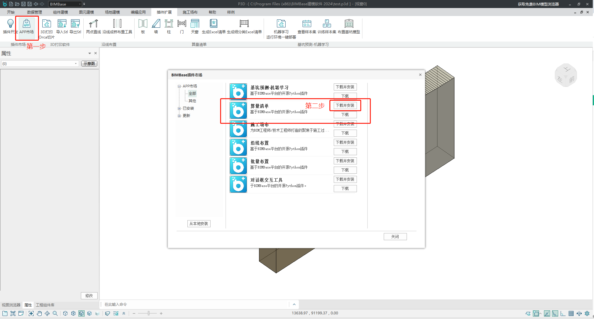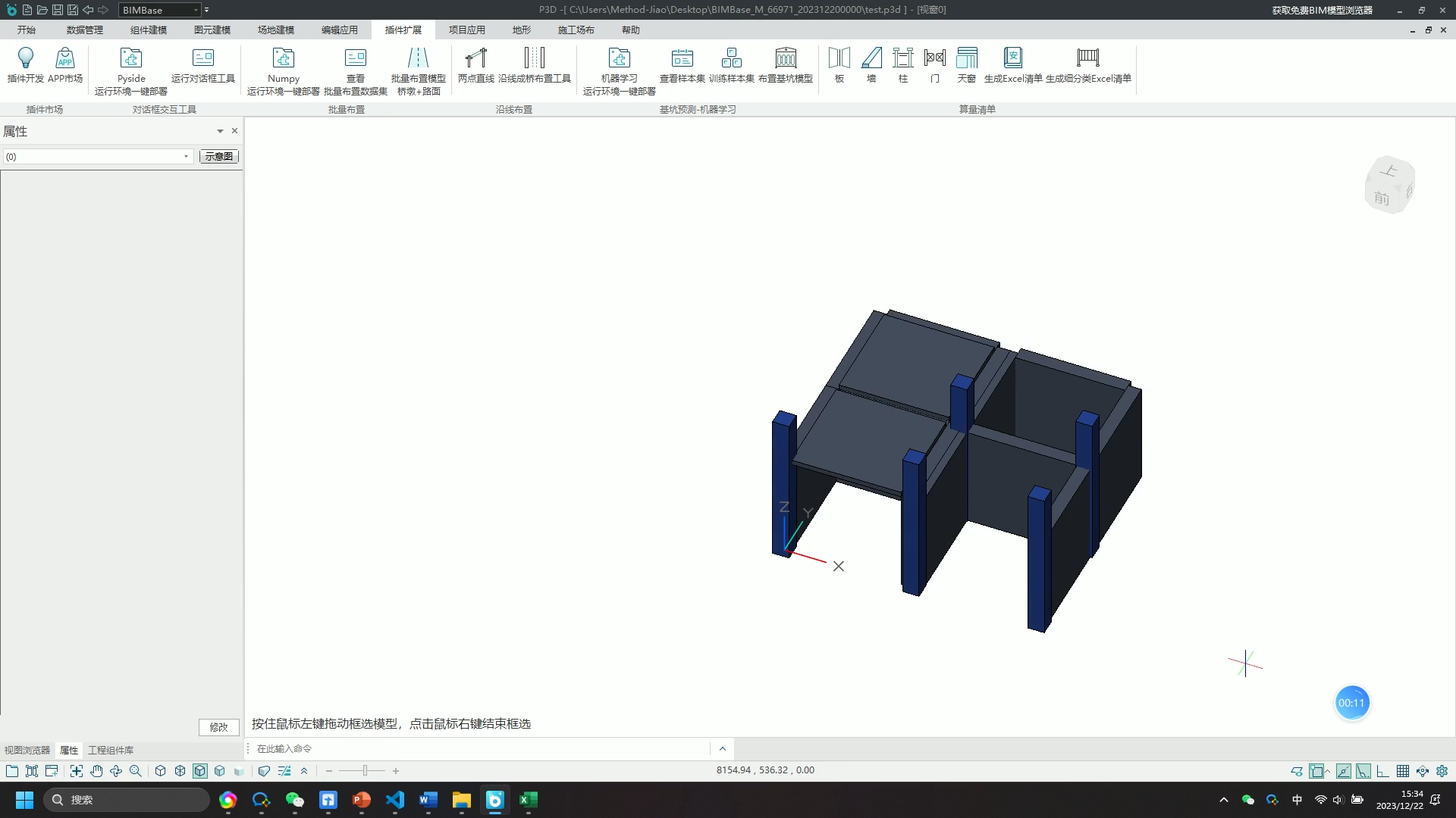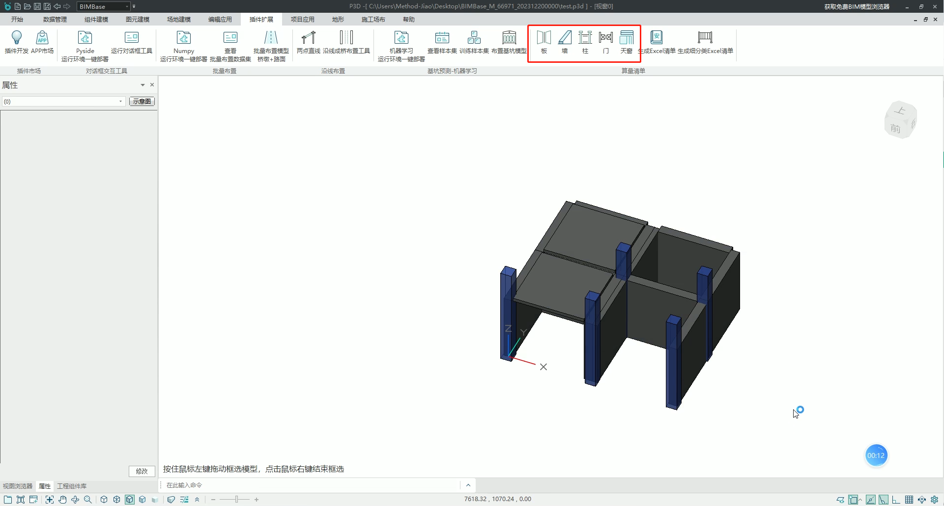 目录 搜索 展开 一.插件开发入门1 环境配置与基础开发1.1 软件安装与VSCode环境配置1.2 软件界面介绍与基础概念2 Python插件开发2.1 Python插件开发标准工作流2.2 实战Python组件库插件开发2.3 实战Python插件开发2.4 插件的打包发布流程3 核心pyp3d库介绍3.1 第一个Python模型3.2 构件库社区4 Python第三方库使用指南4.1 本地环境安装第三方库4.2 使用bat-pip方式安装4.3 Ribbon菜单配置bat5 实际案例5.1 机器学习-基坑预测5.2 露营场布6 常见问题与注意事项6.1 常见终端报错6.2 布置成功后看不见模型6.3 关于布尔后变多面体(精度下降)的解决方法二.Python建模接口文档1 主要函数1.1 圆弧线:Arc1.2 立方体:Cube1.3 缩放函数:Scale1.4 线:Line1.5 截面 Section1.6 扫掠体 Sweep1.7 放样体 Loft1.8 球 Sphere1.9 圆柱体 Cone1.10 四棱台 Box1.11 圆角管 FilletPipe2 旋转、平移、镜像2.1 旋转 rotate2.2 平移 translate2.3 镜像 mirror2.4 就近原则3 线性排布 Linspace4 布尔与组合5 文字6 贴图7 进阶内容7.1 旋转布置/两点布置7.2 如何实现属性表下拉选项7.3 进阶函数8 生成BFA文件三.Python插件接口文档1 基础接口1.1 选择工具1.2 几何实体1.3 属性获取1.4 属性操作2 进阶接口2.1 制作动画2.2 制作对话框2.3 调用BIMBase命令2.4 对话框demo四.BIMBase插件案例说明书BIMBase插件-3D打印BIMBase插件-算量清单BIMBase插件-基坑预测-机器学习BIMBase插件-沿线布置BIMBase插件-对话框交互工具BIMBase插件-批量布置 暂无相关搜索结果! BIMBase插件-算量清单 BIMBase插件-算量清单插件简介基于BIMBase建模软件的开源Python插件,案例内展示实现了一个输出excel清单的功能,欢迎零基础的用户探索实现自己的机器学习探索功能。案例内包含完整的使用教程与代码注释,对于零基础开发人员也有非常友好的体验。 插件运行效果 插件安装运行步骤 三步走算量清单-插件下载 1.下载安装 2.点击板、墙、柱、门等构件进行布置 3.点击【生成Excel清单】,左键框选构件,右键结束框选 提交评论