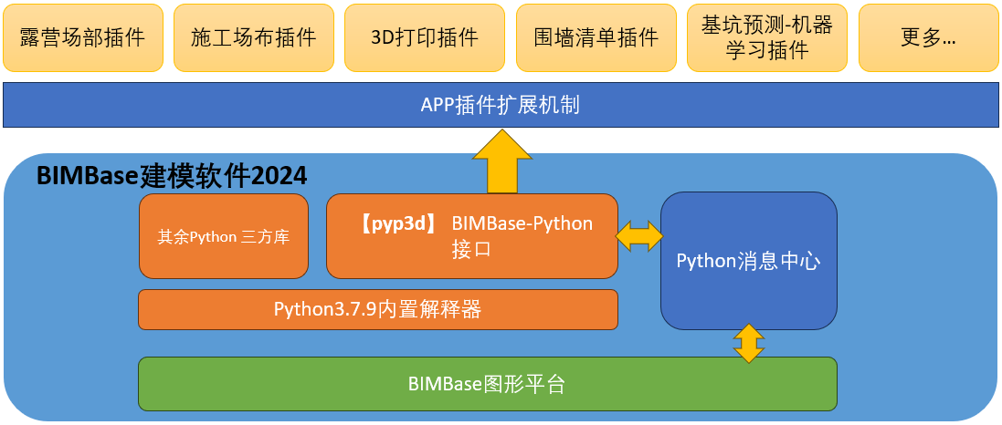 目录 搜索 展开 一.插件开发入门1 环境配置与基础开发1.1 软件安装与VSCode环境配置1.2 软件界面介绍与基础概念2 Python插件开发2.1 Python插件开发标准工作流2.2 实战Python组件库插件开发2.3 实战Python插件开发2.4 插件的打包发布流程3 核心pyp3d库介绍3.1 第一个Python模型3.2 构件库社区4 Python第三方库使用指南4.1 本地环境安装第三方库4.2 使用bat-pip方式安装4.3 Ribbon菜单配置bat5 实际案例5.1 机器学习-基坑预测5.2 露营场布6 常见问题与注意事项6.1 常见终端报错6.2 布置成功后看不见模型6.3 关于布尔后变多面体(精度下降)的解决方法二.Python建模接口文档1 主要函数1.1 圆弧线:Arc1.2 立方体:Cube1.3 缩放函数:Scale1.4 线:Line1.5 截面 Section1.6 扫掠体 Sweep1.7 放样体 Loft1.8 球 Sphere1.9 圆柱体 Cone1.10 四棱台 Box1.11 圆角管 FilletPipe2 旋转、平移、镜像2.1 旋转 rotate2.2 平移 translate2.3 镜像 mirror2.4 就近原则3 线性排布 Linspace4 布尔与组合5 文字6 贴图7 进阶内容7.1 旋转布置/两点布置7.2 如何实现属性表下拉选项7.3 进阶函数8 生成BFA文件三.Python插件接口文档1 基础接口1.1 选择工具1.2 几何实体1.3 属性获取1.4 属性操作2 进阶接口2.1 制作动画2.2 制作对话框2.3 调用BIMBase命令2.4 对话框demo四.BIMBase插件案例说明书BIMBase插件-3D打印BIMBase插件-算量清单BIMBase插件-基坑预测-机器学习BIMBase插件-沿线布置BIMBase插件-对话框交互工具BIMBase插件-批量布置 暂无相关搜索结果! 2 Python插件开发 Python插件开发功能BIMBase建模软件提供的Python插件开发功能可以满足绝大多数场景的使用需求。得益于Python丰富的第三方库和BIMBase建模软件的pyp3d接口库,细到模型属性提质、大到AI大模型生成式建模,都可以在Python插件中得以实现,插件机制架构图如下所示。 如果我不会python怎么办不会python的朋友不用担心,BIMBase-Python开发所用专业知识较少,遇到问题随用随查,让我们先跟着手册继续向下走吧。 提交评论