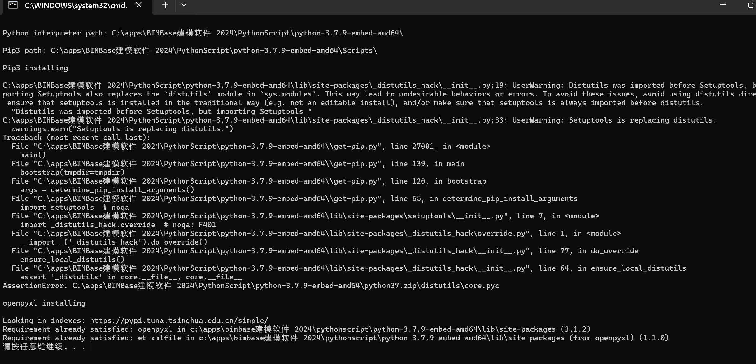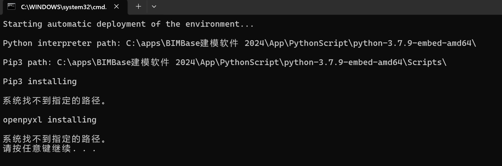 注意: 当bat文件移动至下一级文件夹,路径为【\BIMBase建模软件 2024\App\3围墙清单\围墙清单\测试】时,bat文件找不到python路径安装失败