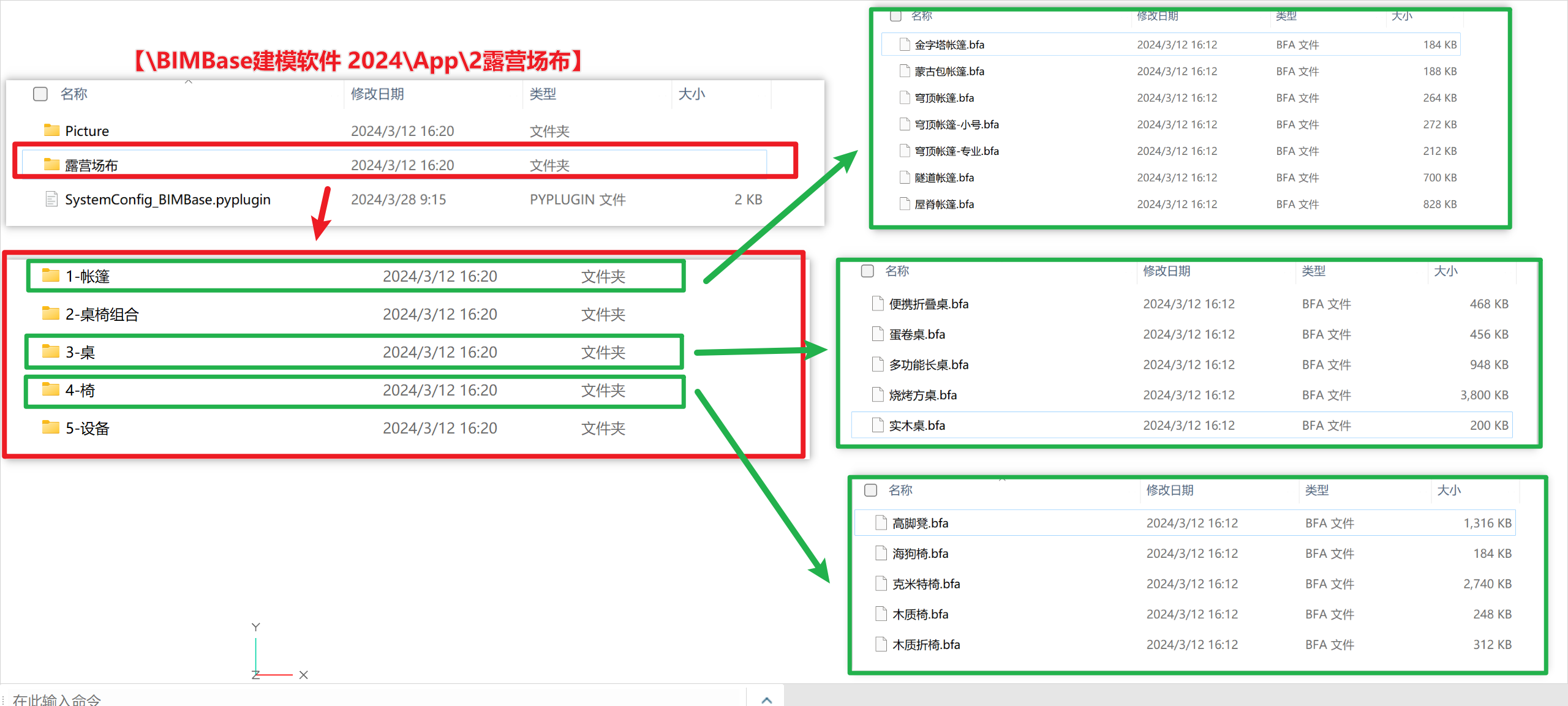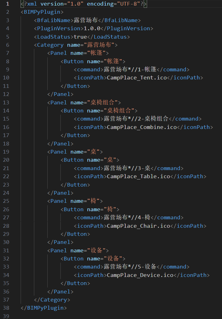 目录 搜索 展开 一.插件开发入门1 环境配置与基础开发1.1 软件安装与VSCode环境配置1.2 软件界面介绍与基础概念2 Python插件开发2.1 Python插件开发标准工作流2.2 实战Python组件库插件开发2.3 实战Python插件开发2.4 插件的打包发布流程3 核心pyp3d库介绍3.1 第一个Python模型3.2 构件库社区4 Python第三方库使用指南4.1 本地环境安装第三方库4.2 使用bat-pip方式安装4.3 Ribbon菜单配置bat5 实际案例5.1 机器学习-基坑预测5.2 露营场布6 常见问题与注意事项6.1 常见终端报错6.2 布置成功后看不见模型6.3 关于布尔后变多面体(精度下降)的解决方法二.Python建模接口文档1 主要函数1.1 圆弧线:Arc1.2 立方体:Cube1.3 缩放函数:Scale1.4 线:Line1.5 截面 Section1.6 扫掠体 Sweep1.7 放样体 Loft1.8 球 Sphere1.9 圆柱体 Cone1.10 四棱台 Box1.11 圆角管 FilletPipe2 旋转、平移、镜像2.1 旋转 rotate2.2 平移 translate2.3 镜像 mirror2.4 就近原则3 线性排布 Linspace4 布尔与组合5 文字6 贴图7 进阶内容7.1 旋转布置/两点布置7.2 如何实现属性表下拉选项7.3 进阶函数8 生成BFA文件三.Python插件接口文档1 基础接口1.1 选择工具1.2 几何实体1.3 属性获取1.4 属性操作2 进阶接口2.1 制作动画2.2 制作对话框2.3 调用BIMBase命令2.4 对话框demo四.BIMBase插件案例说明书BIMBase插件-3D打印BIMBase插件-算量清单BIMBase插件-基坑预测-机器学习BIMBase插件-沿线布置BIMBase插件-对话框交互工具BIMBase插件-批量布置 暂无相关搜索结果! 5.2 露营场布 除了本文上面介绍的【围墙清单】【基坑预测】等功能相对复杂的Python插件外,在一些使用场景我们也需要“模型包”这样的工具方便布置,如本章介绍的【露营场布】,就是为方便露营爱好者的用户朋友打造的快速布置露营场景的建模插件,其本质上是将各类模型转换格式为bfa后,按分类存在不同文件夹下存储,文件夹结构与配置文件如下: 弹出组件库的写法与直接执行py文件的command字段写法不同,可对比5.1章节的配置文件。 部分效果展示,详细内容可查看第四大章。 提交评论